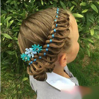 黑长直发的小女孩梳这样的公主头发型再合适不过了呢,将发丝做大偏分的梳理,将发量多的一侧发丝分成三束,分别做蜈蚣辫编发造型,最后将发尾部分的发丝做成三个花朵盘发造型。