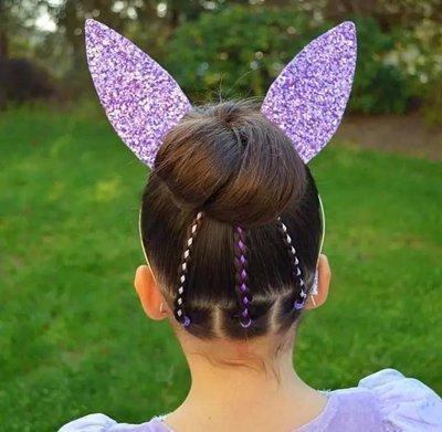 这次的编发是从脑后开始的,将脑后最下层的发丝分成三个部分,分别和彩色的毛线一起做成麻花辫编发,将发辫和上方的发丝一起在发顶做了饱满感的花苞头发髻,在发顶搭配上立体的蝴蝶结发箍。