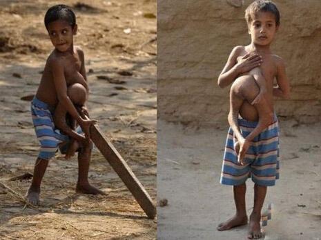 现年8岁的迪帕克·库马尔是一名来自印度比哈尔邦的小男孩,从一出生,他的外貌就把周围的人惊得目瞪口呆:他长着4条腿和3支手臂,在他腹中有个孪生弟弟和他一起来到这个世界上。