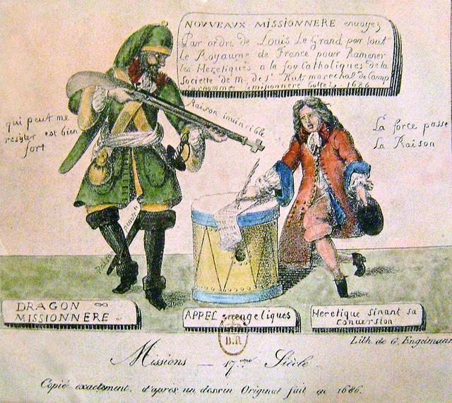 法国休京诺迫害时期一位龙骑兵正在恫吓一位休京诺派修士的漫画
