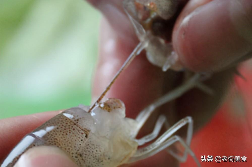 1、一只手捏住虾头,另一只手捏住虾身。