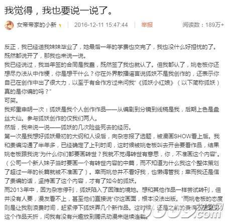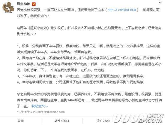 就在夏达发布这条微博一个小时后,《狐妖小红娘》的作者小新,也发布了微博,指证夏天岛工作室苛刻员工的事件!甚至在《狐妖》连载之际,有过几次险些死去的经历!破罐子破摔的激烈言辞,让事件的真实性达到新高度!