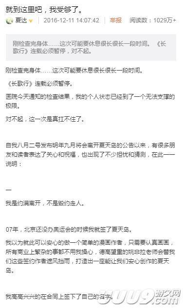 夏达微博说到,明年9月将离开夏天岛工作室。并且强调是期满走人,不是毁约走人。在之后叙述了在夏天岛这几年种种悲惨经历,霸权合同、坑货运营、众筹骗局。似乎种种事件都在指向夏天岛工作室对员工的欺骗和苛刻。