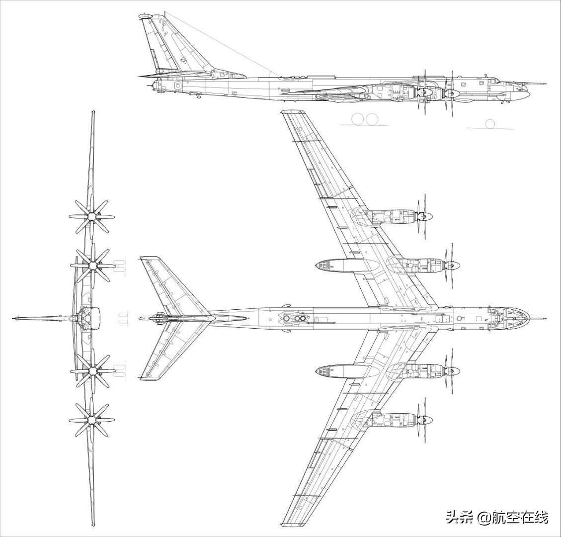 麦亚西舍夫设计局研发的M-4重锤轰炸机"野牛"采用涡轮喷射发动机,由于作战半径只有可悲的5,600km,因此最后沦落成为苏联空军的"加油工"(一个背负大油槽的空中加油机,并于1994年退役),随后也被取代。于是图波列夫设计局又走上俄罗斯逻辑的路子,改采用具有8片桨叶的库兹涅佐夫 NK-12(英语:Kuznetsov NK-12)M型对转涡轮螺旋桨发动机,号称具备12,000轴马力(8948kW),后续改型达到15,000轴马力(11030kW)。采用这种引擎不仅仅动力强大,事实上在油耗上与维修保养上也比涡轮喷射发动机简单,耐用度也提高了许多。