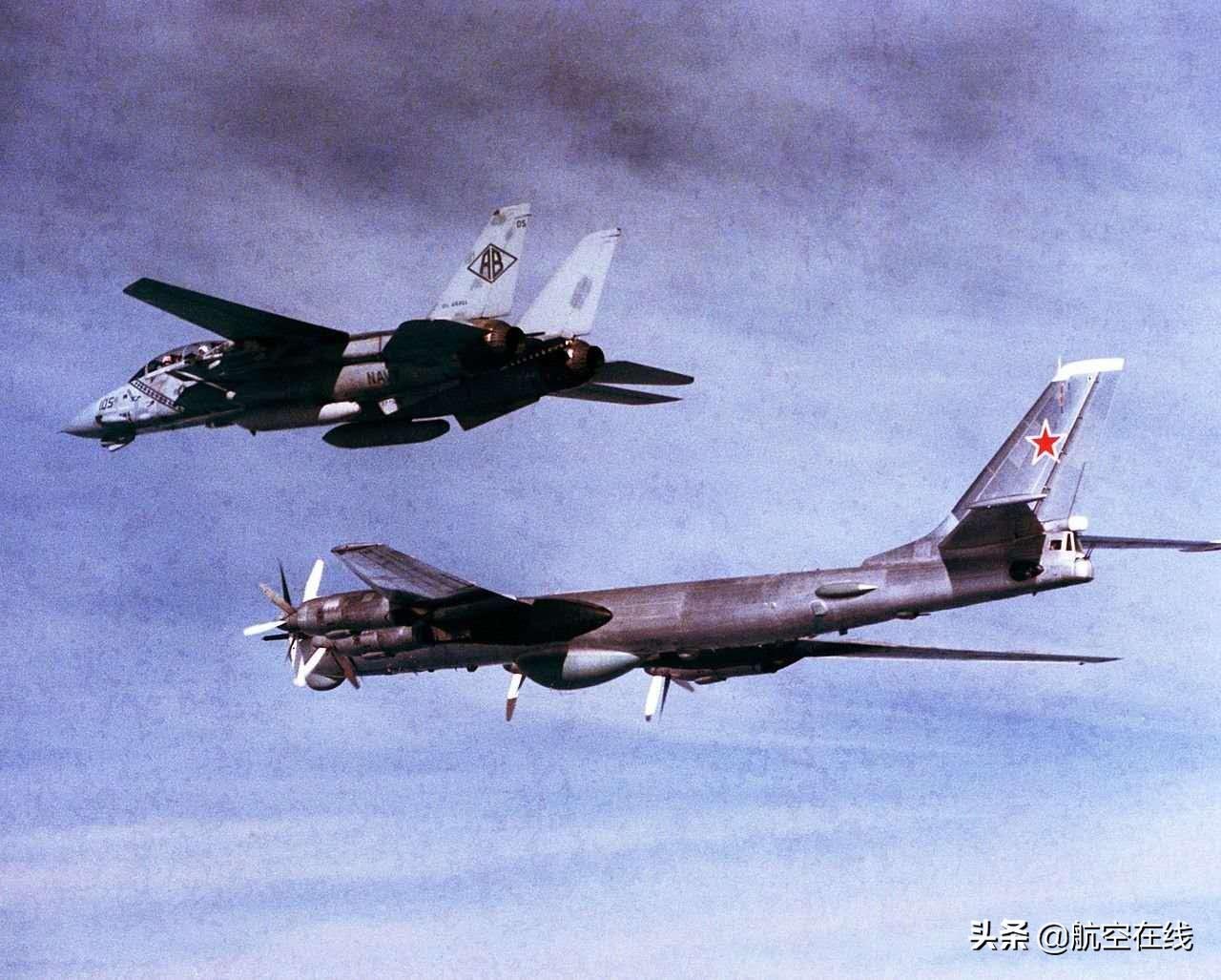1985年北大西洋公约组织萨发里海洋演习中,美国海军一架F-14雄猫式战机强制伴飞另一架前来"包打听"的Tu-95M