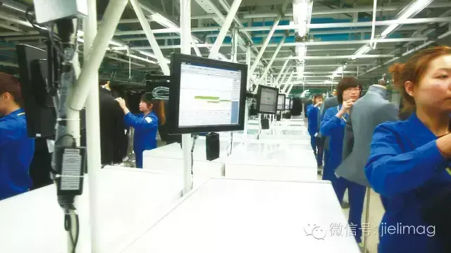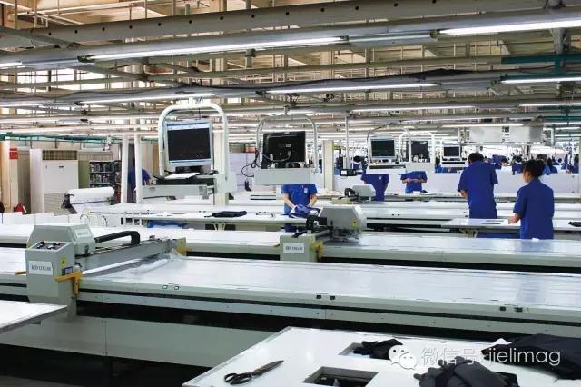 布料准备部门根据订单准备面料,裁剪部门按要求裁剪。裁剪后的大小不一、色彩各异的布片按照一套西服的要求挂在一个吊挂上,同时会配戴一个射频识别电子标签,工人再用电脑识别终端识别衣服上的电子标签,按照标签中顾客详细的要求进行生产,诸如里衬、扣子、袖边等技术数据。红领的工人不再是机械地生产同一件衣服,做同一个动作,从他们的手中最终呈现的是独一无二的服装。