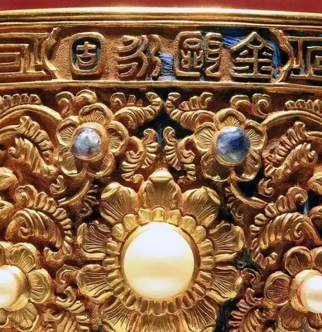 这件国宝级文物,杯口边铸有“金瓯永固”、“乾隆年制”篆书,通体錾刻缠枝花卉,其上镶嵌数十颗硕大珍珠、红蓝宝石和粉色碧玺。