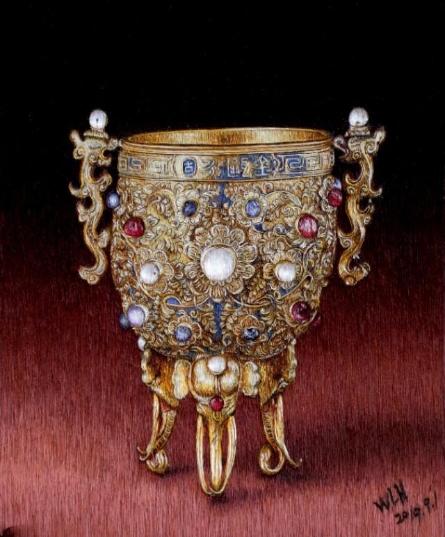 根据清“内务府活计档”记载,乾隆皇帝对此杯的制作十分重视,不仅调用内库黄金、珍珠、宝石等珍贵材料,而且精工细作,曾多次修改,直至皇帝满意为止。因此,该杯一直被清代皇帝视为珍贵的祖传法宝。