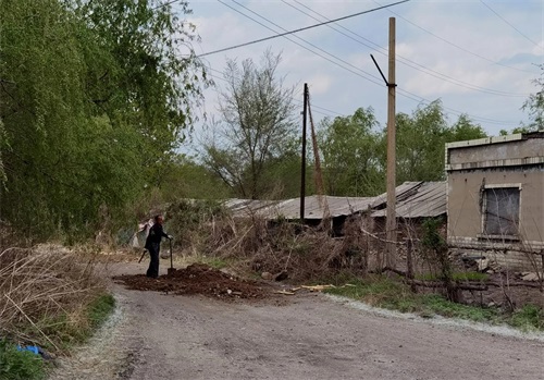 柏油路变成土路,坑洼不平,有人在义务修路