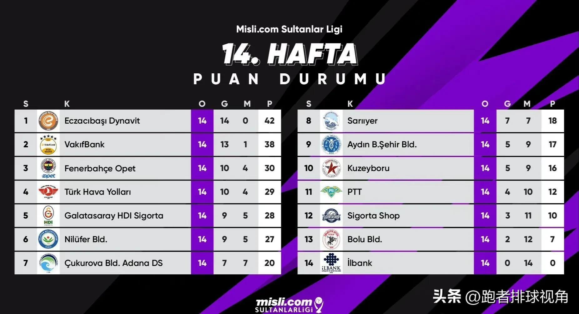 土耳其女排联赛第十四轮的比赛已经全部结束,作为女排顶级联赛,这项联赛吸引了埃格努、博斯科维奇、加比等众多国际顶尖球员加盟,所以备受关注,最终经过十四轮的较量以后,各队最新排名依次如下:伊萨奇巴希、瓦基弗银行、费内巴切、土耳其航空、加拉塔萨雷、尼吕费尔、库库罗瓦、萨勒耶尔、艾登都会、库泽博鲁、PPT、保险商店、博卢、伊尔银行,其中伊萨奇巴希保持全胜。