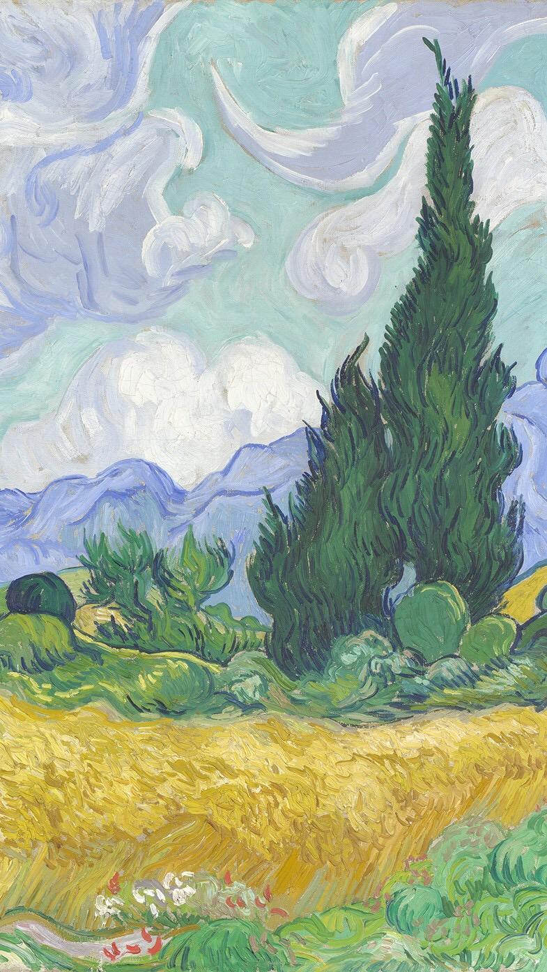 梵高作品:《麦田里的丝柏树》,创作于1889年