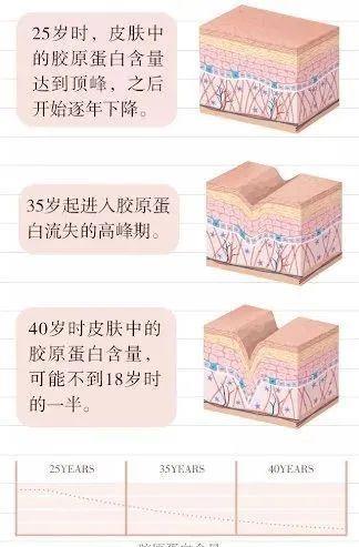 女性从20岁左右开始,胶原蛋白开始流失,25岁后流失速度加快,35岁进入流失高峰期,40岁时皮肤中的胶原蛋白含量不到18岁时的一半。