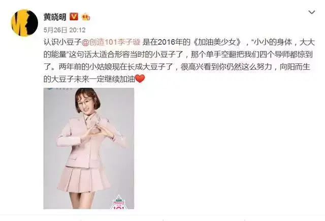 在上个月还亲自发微为小豆子加油,表示:认识小豆子是在2016年的《加油美少女》,“小小的身体,大大的能量”来形容小豆子是在适合不过了。这两年也看到了她的成长和努力,希望豆子的未来能够继续加油。