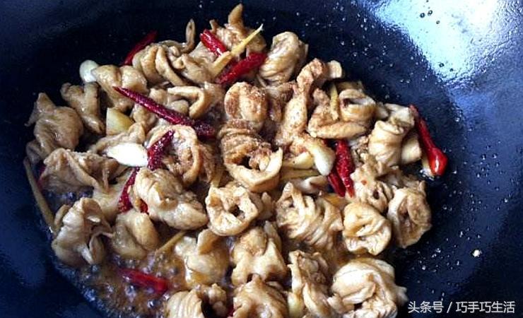 2、肥肠下锅是一定要热油,冒烟的那种,要不然不脆!
