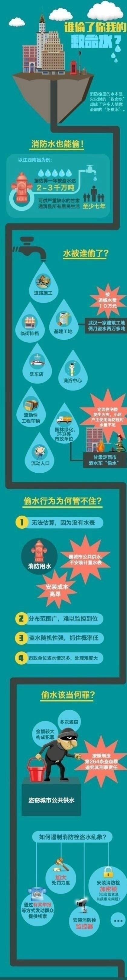 现在,有些地方消防栓的水成了许多人随意盗取的“免费水”。这些“救命水”被谁偷走了?偷水该当何罪?一张图告诉你。