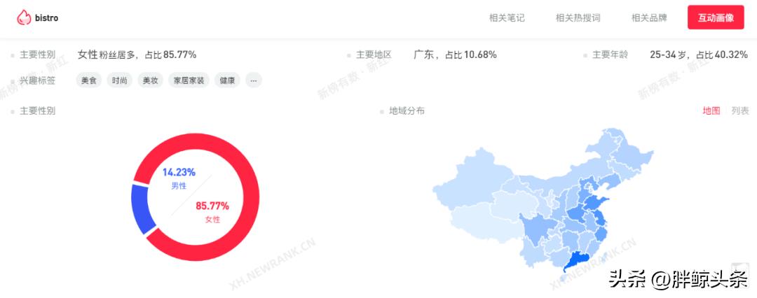 从小红书提供的数据洞察中我们发现,bistro目前在中国沿海地区最为普及,并在新一线城市呈现旺势。值得注意的是,在互动画像中,女性占据绝对比例,并以25-34岁为主要年龄。