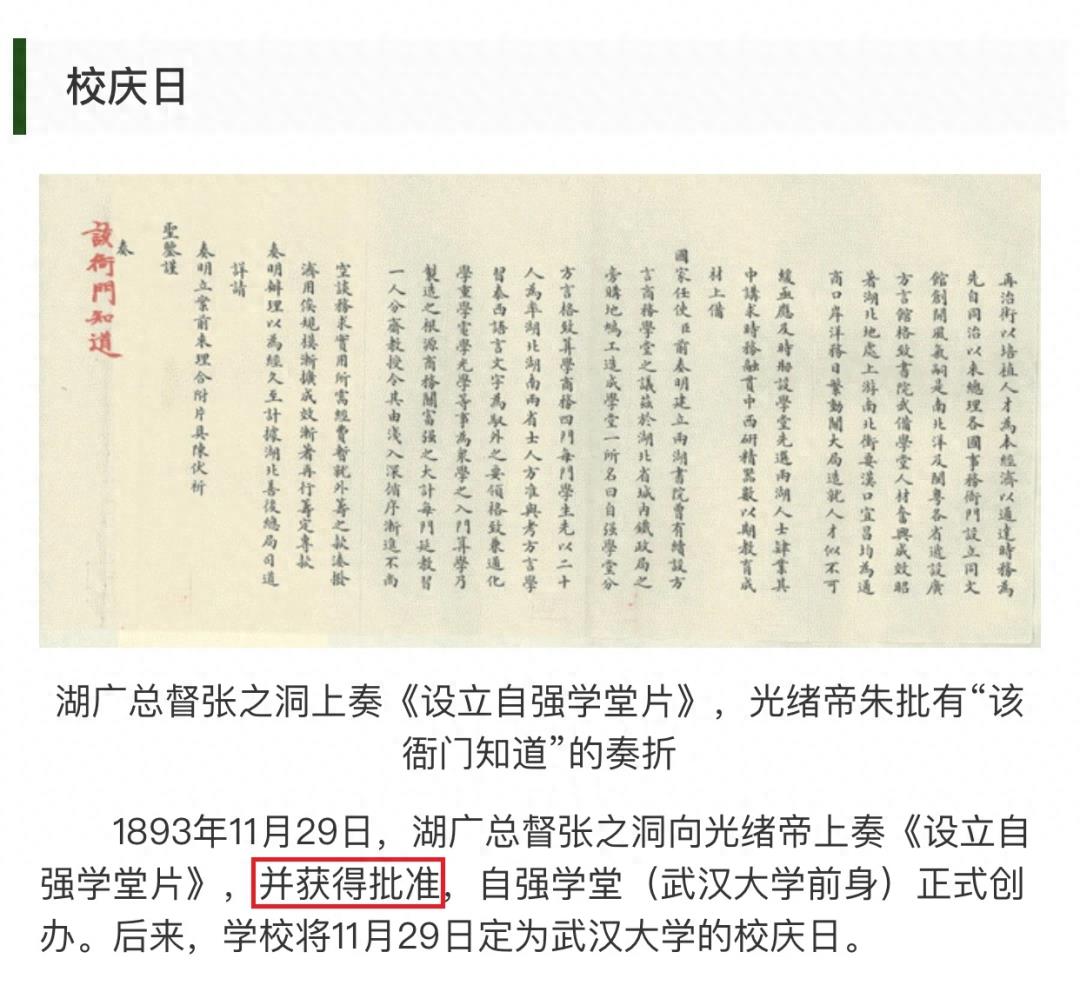 不过,在30年前,当武汉大学决定将“校史”人为地拉长20年的那个时候,那些主事者们对于以上所述的这几个日期都茫然无知,特别是甚至都没搞清楚《设立自强学堂片》获得朱批的时间究竟是在哪一天,只知道11月29日是上奏的日期,于是,便只能匆匆忙忙地把这一天草草定为所谓的“校庆日”了。