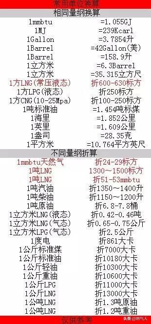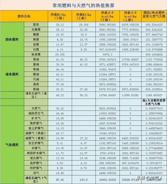 天然气换算表
