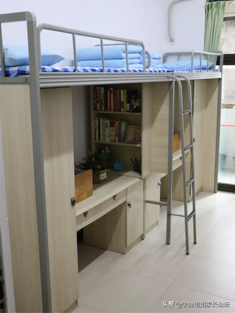 宿舍还是比较宽敞的,高一,高二六人间,高三四人间,上床下桌。有空调(学校统一控制,学生讲不常开)和独立卫生间和洗澡间,洗澡和洗漱都方便。每楼有开水,除了周六晚上22.00到周天下午没热水,其他时候都可以洗热水澡。一楼有洗衣房,投硬币洗衣服,硬币在生活老师那里换。寝室用电学校严格控制,手机充电只能去教室抢插座(偷着藏着使用)。女生宿舍有专门吹头发的地方,男生没有。每层楼基本上有四个生活老师。周末可以住校,并有专门老师负责管理。
