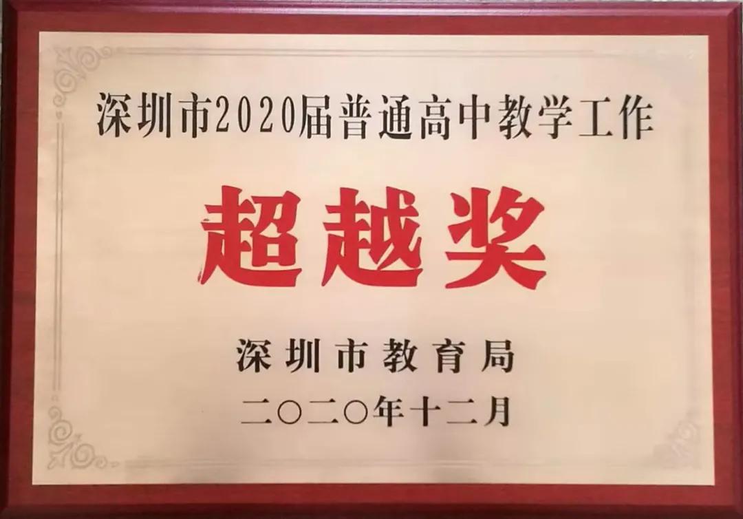 低进高出,优进特出。高考成绩持续多年排名深圳市民办学校前列,一大批中考成绩不理想的同学,以优异的成绩考入重点本科院校。入学中考分数集中在4-6级的学生,高考中进入到1-3级,连续多年获得深圳市高考先进单位——超越奖。