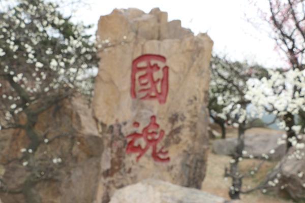 踏进梅园,首先映入眼帘的是迎宾彩门左侧竖立的山湖石,上面镌刻着“国魂”二字,这是书画家岳石教授的手笔。观后使人想起许多古人“咏梅”的诗句:“万花敢向雪中放,一树独先天下春”、“铁骨傲霜雪,幽香透国魂”……
