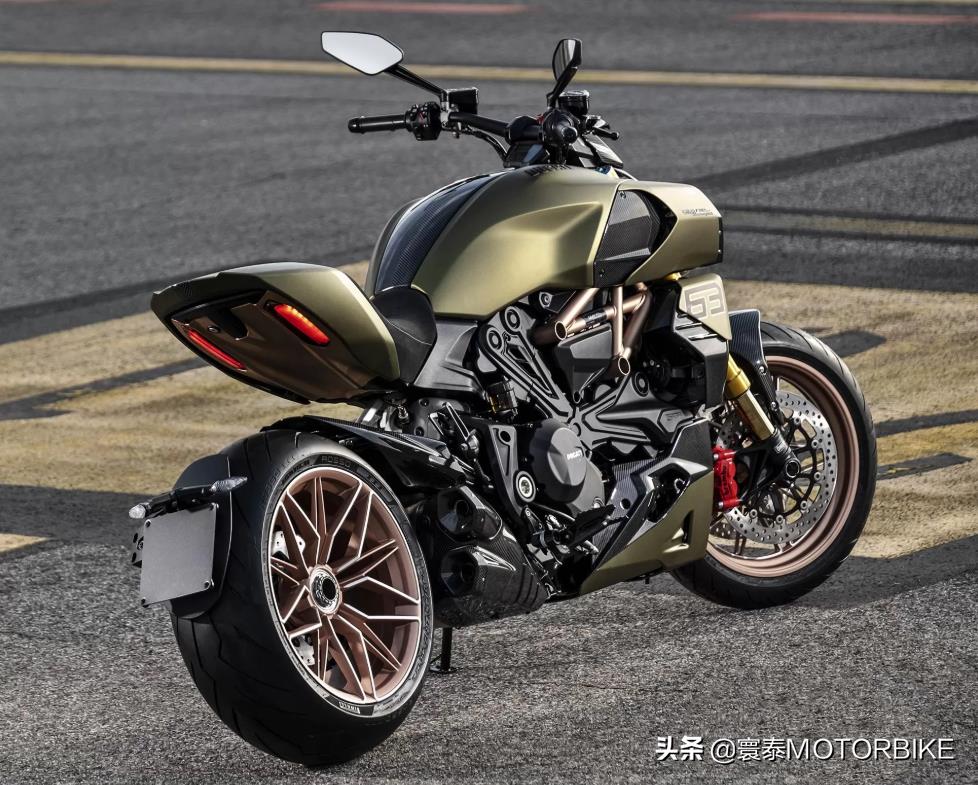 Diavel 1260 Lamborghini的车架、座椅尾部和锻造轮毂均采用“Electrum Gold”电金色修饰。