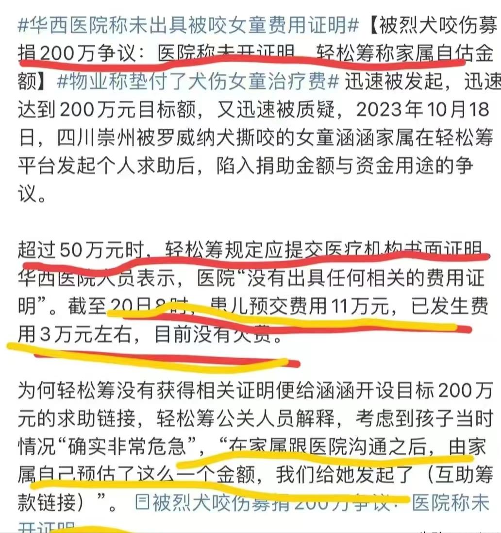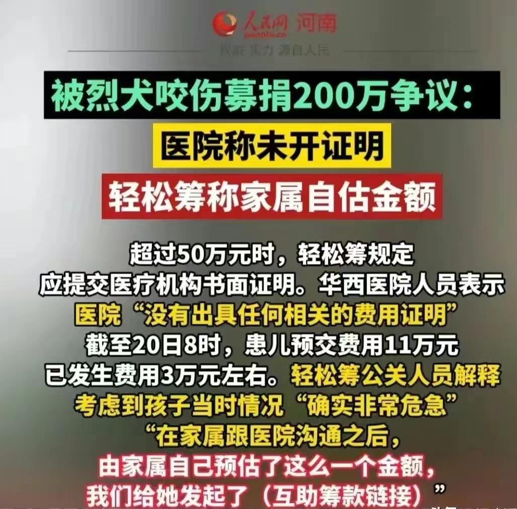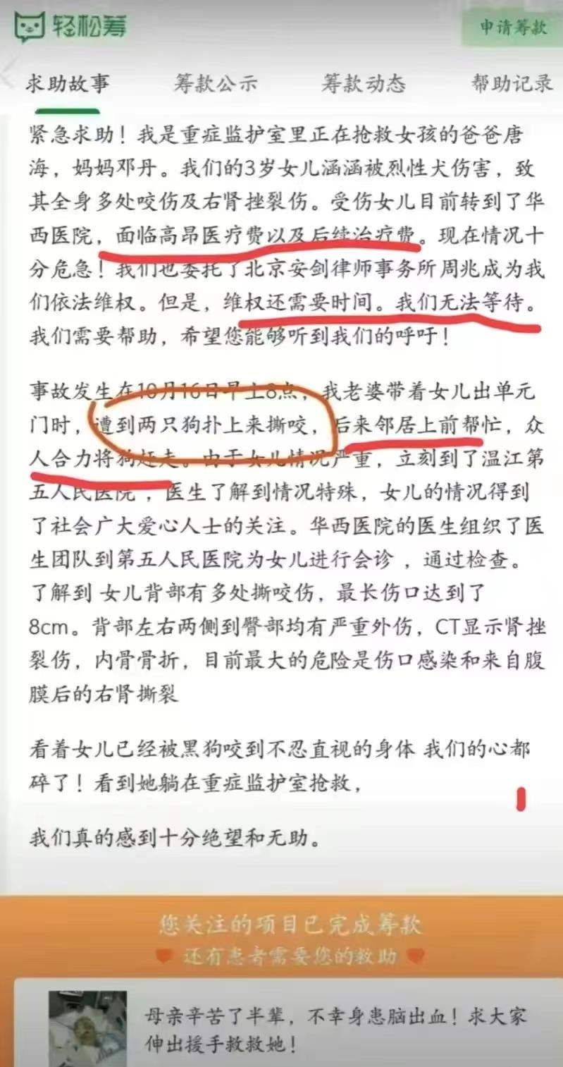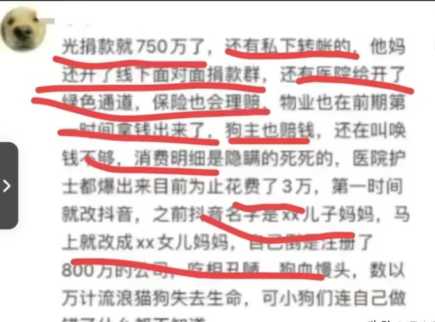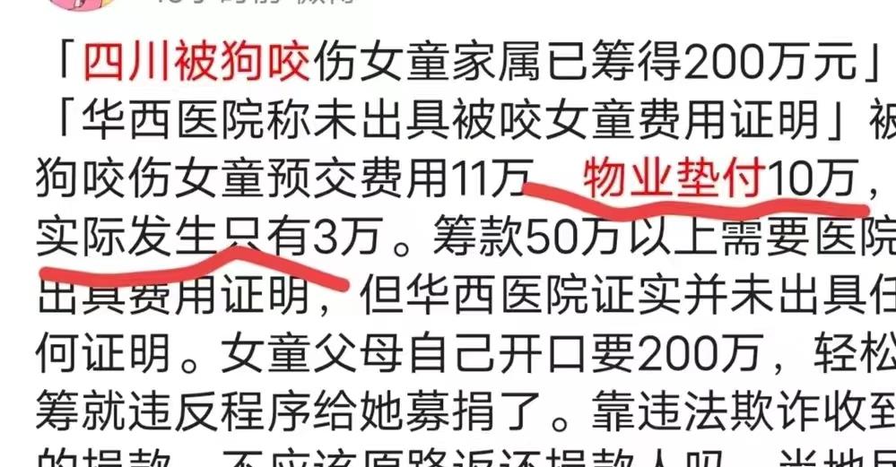 利用别人的善心来筹款。而事实上,你是有能力支付的,责任人已经确认,并且愿意赔偿,狗的主人当天就到警局了。恒大物业垫付了10万元,恒大的许家印真的大方,这种行为真的不道德,而且可能会引发严重后果。