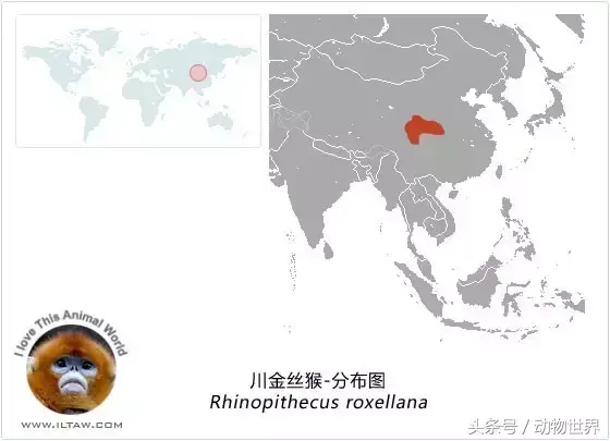 川金丝猴是中国的特有种,分布在湖北、四川、陕西、甘肃相交界的森林之中,分布区域在岷山、邛崃山、大雪山、小凉山、秦岭、神农架、摩天岭北坡。