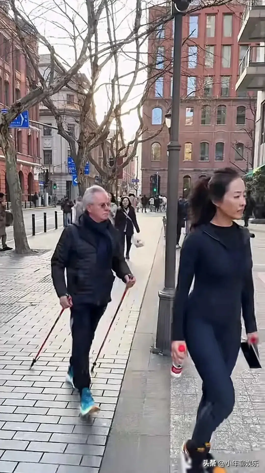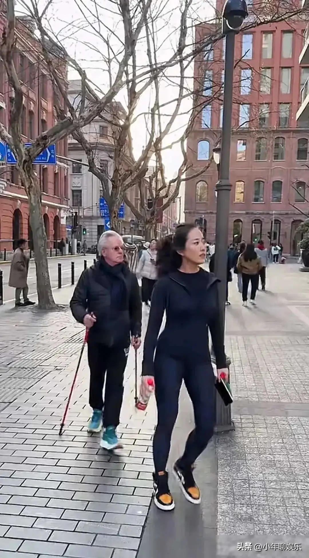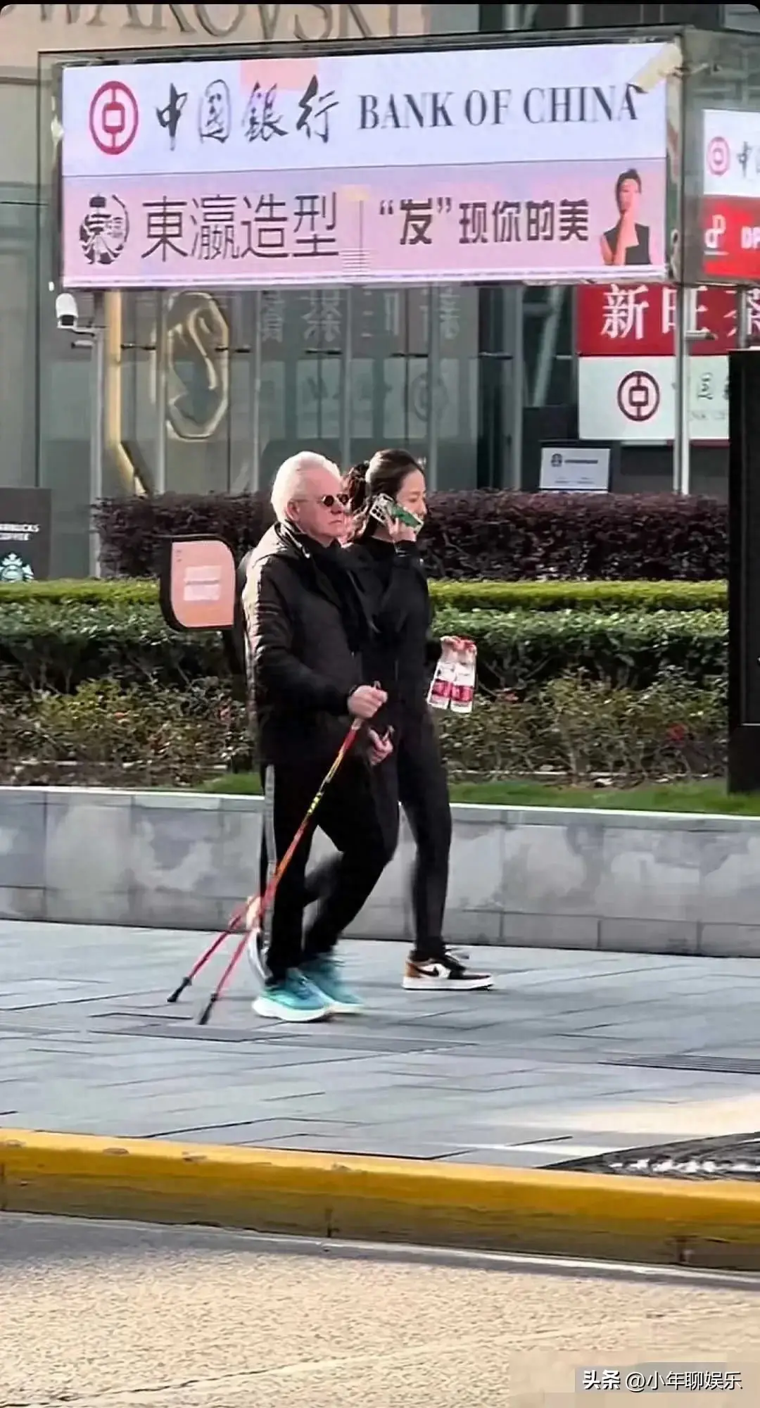 他可不是一个人,身边还跟着个美女呢,手里提着两瓶农夫山泉。