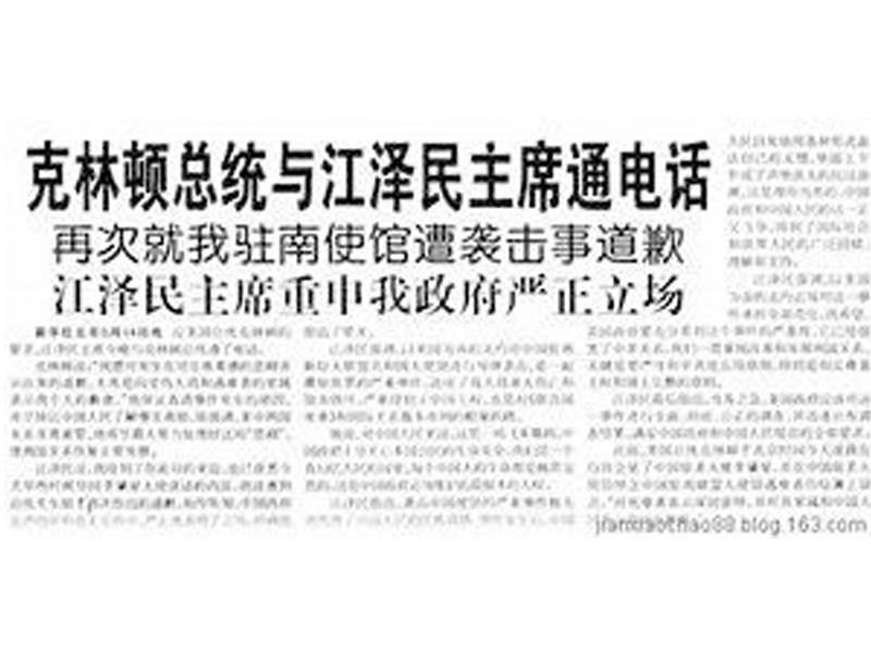 1999年5月,北约空军轰炸南斯拉夫,却用导弹袭击了中国驻南联盟大使馆,造成三名中国记者死亡。