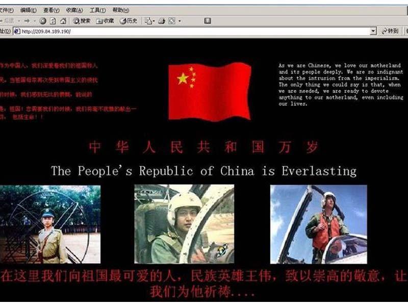 除了普通网友,另一方面,黑客们也在网络上分享美国网站的密码和漏洞,造成美国大使馆、美国空军网站等多家网站首页被“黑”,挂上中国国旗,甚至是烈士父亲给美国总统写的信(中英文)。