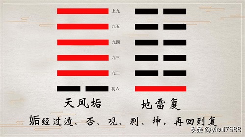 《序卦》曰:“物不可以终剥,剥穷上返下,故受之以复”。事物没有剥尽的道理,所以剥到了极点,就出现了复,阴极则阳生,剥卦里面,阳爻在上,受五阴的逼迫,最后复生在下,在上面走到了尽头,于是重新在下面出现,所以剥卦后紧跟着就是复卦。