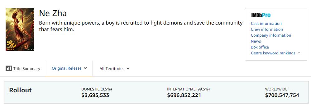 而对于《哪吒》来说,它在中国内地的近50亿票房表现,就更是将其在北美地区的369万美金营收显得有点儿微不足道了。