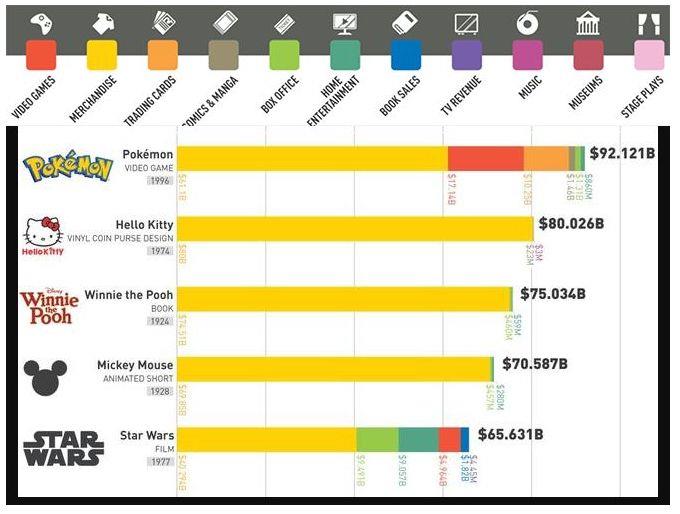 当然,对于迪士尼这家公司来说,票房营收永远都只是“小头”,真正助推其营收和利润的还得属“衍生品”销售呢。不过这个内容就不详细展开了,下面是“全球最值钱IP”的头部排名,你们自个儿好好感受吧(黄色代表衍生品,绿色代表票房)---
