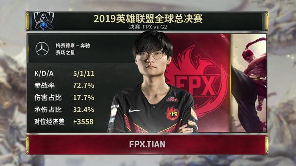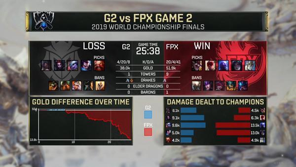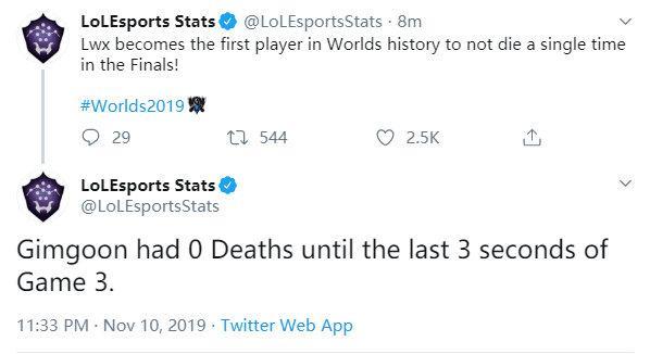 在全场比赛中,节奏完全掌握在了fpx手中,并且创造了多项纪录,靠着第一次参赛便夺得了世界赛的冠军,并且在决赛以碾压之势夺得了比赛的冠军,为LPL赛区拿下第二个冠军。赛后,LPL数据官推也发布了一则数据,LWX成为在世界赛历史上在总决赛唯一一位零死亡的选手,而GimGoon直到比赛结束最后的3秒前,也是0死亡。