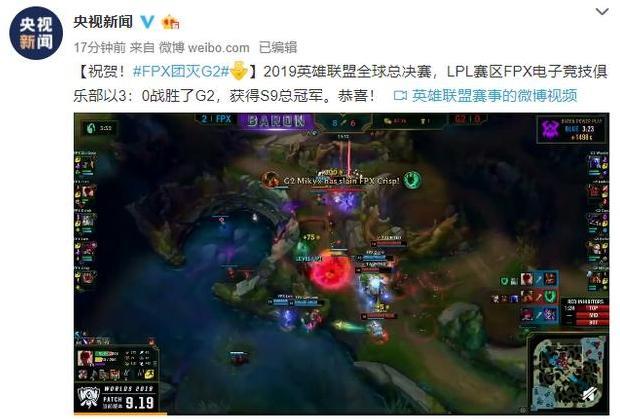 在FPX拿下S9世界赛冠军之后,央视新闻的官方微博发布了FPX在BO5第三局的决胜时刻,并且祝贺了FPX拿下这次的世界赛冠军。这也意味着电子竞技深受国家的认可,电竞已经开始走向更高的层面。
