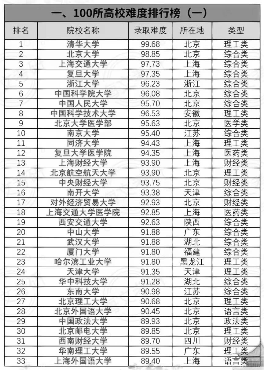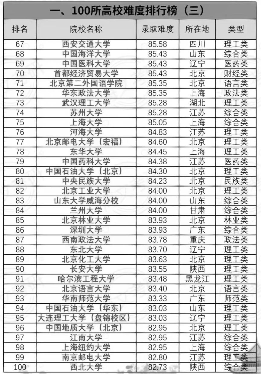我国高校考研录取难度前100强名单: