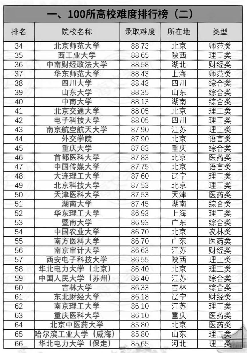 这是考研录取难度大致居第34~66位的高校名单,这些高校并非全都是985、211大学,虽然也有山大、川大等985名校在列,但也有双非大学上榜,可见这些双非大学专业实力也是很强的,在行业内颇有名气和影响力。