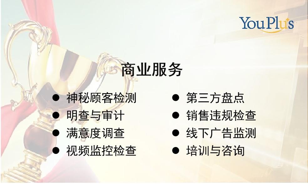 优加调研咨询机构是一家专注于渠道服务监测服务的调研公司,有超过17年的项目经验,在广州北京上海杭州成都设有分公司,服务客户均为国内外知名企业,服务客户累计超过500家,是众多重视客户体验的优秀企业首选的第三方服务监测供应商。