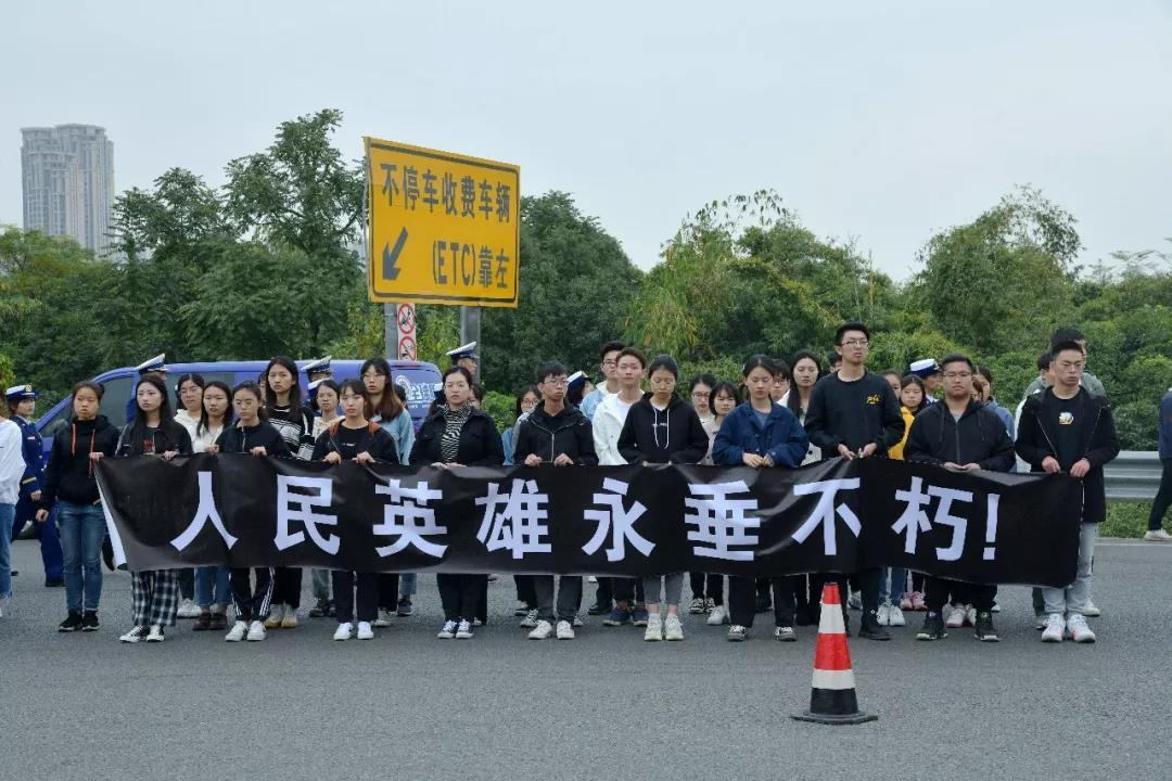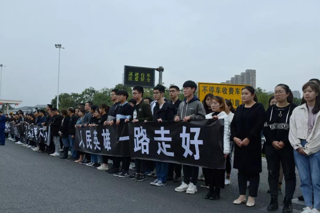 沿途早已站满了自发前来送行的群众,他们怀着对张伟杰烈士的深深敬佩和惋惜之情,或手握菊花,或拉着一条条写着“英雄,一路走好!”“消防烈士,永垂不朽”的横幅送别烈士。