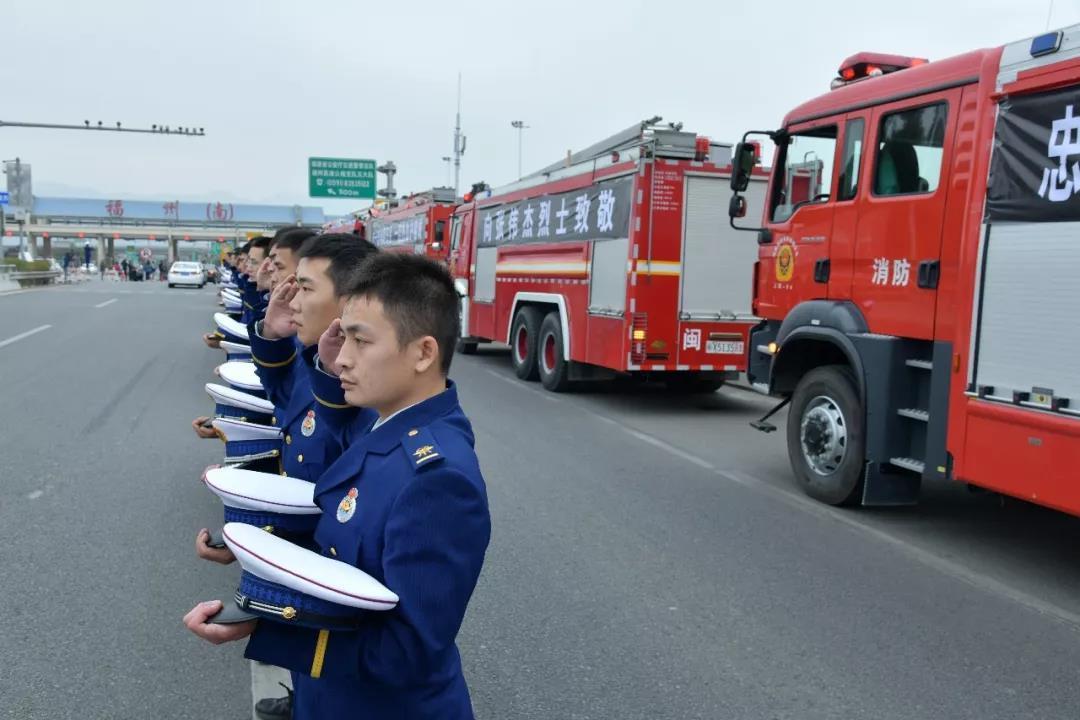 遗体告别仪式后,消防车齐鸣哀笛,披挂素带的灵车缓缓驶向张伟杰烈士的家乡——永春。