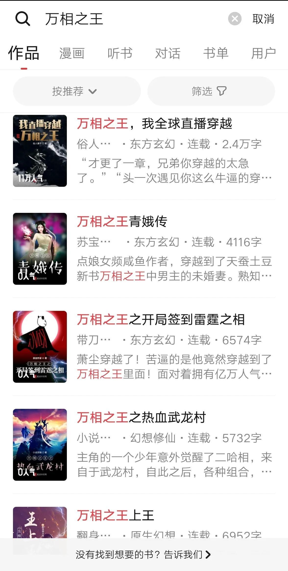 小编粗略地数了一下,《万相之王》发布第三天,就已经能够找到20本由原著衍生的小说。其中标注衍生同人文的就有五本。而且,书名还五花八门。可见跟风者有多热情多有才了。