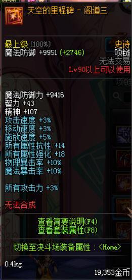 项链可以选择警备队长金玉项链或者新的项链史诗-天空的里程牌-阁道三,从上图中不难看出这件首饰比金玉项链属性更强,机械元首重在怼火强、智力、魔攻/魔暴,在90级版本中选择这件首饰会让机械元首玩家们伤害更加明显。