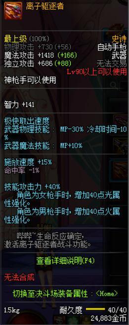 离子驱除者是90级版本中较为强势的武器,男性枪手使用增加40点火强化属性,相当于免费获得了一个火属性宝珠附魔效果,这点是非常强势的,当给这把武器再次附魔魔攻的宝珠会将机械元首的爆炸输出更为强势哦。