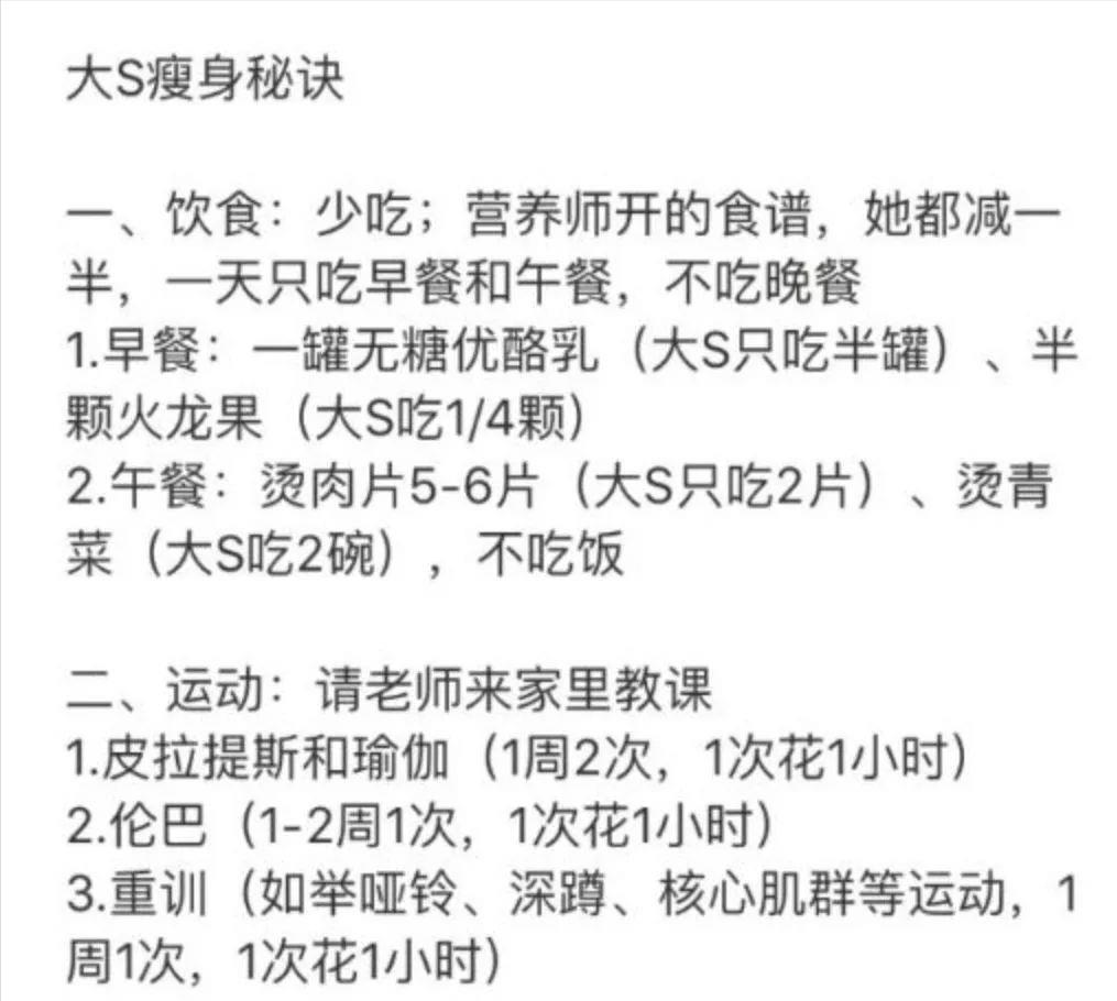 瘦身确实需要控制饮食+运动,但是控制饮食不该是大S这样极端。如果我们普通人也像她这样吃,人是瘦下来了,身体也毁了。