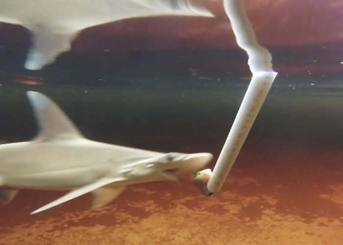 研究人员给实验的窄头双髻鲨喂以海草。