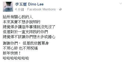 李玉玺5日凌晨在脸书上发文透露,针对日前与吴心缇的绯闻,做出了澄清,「给所有关心我的人,本来其实不想多说明的,总觉得多讲这件事情就没完没了,但是对于一直支持我的你们,总觉得不该让你们想太多或担心。」接着,他也强调自己依旧处于单身状态,还开玩笑说,「不用心碎,也不用祝福,新年快乐!哈哈哈哈哈哈哈。」