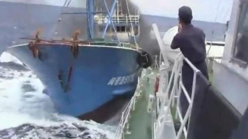只听“轰隆”一声,日本军舰被我国渔船正面撞击,把军舰上的日本人吓了一大跳。