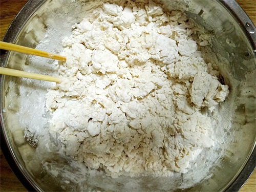 第一步:取盆放入面粉,加入2克食用盐(增加筋性)拌匀,从中间分成两半,一半用开水和面,一半用凉水和面,搓成棉絮状后,再揉到一起。