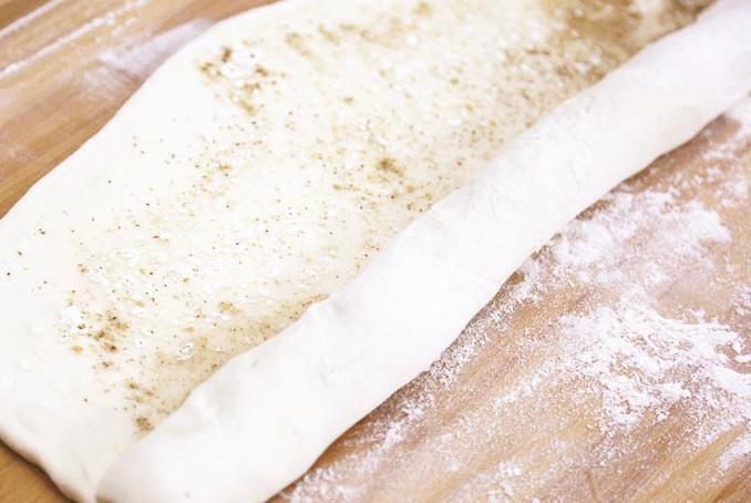 第三步:直接擀制(这时不要再揉面了,避免再次起筋)直接把它擀成大饼,表面再刷上一些油,撒一点盐和花椒粉调味,然后卷起来。用刀切成大小均等的面剂子。剂子两端收一下口,像拧毛巾一样转几圈,再压一下,这样的饼的层次会更多。面饼做好后不要直接用,盖上保鲜膜松弛20分钟。
